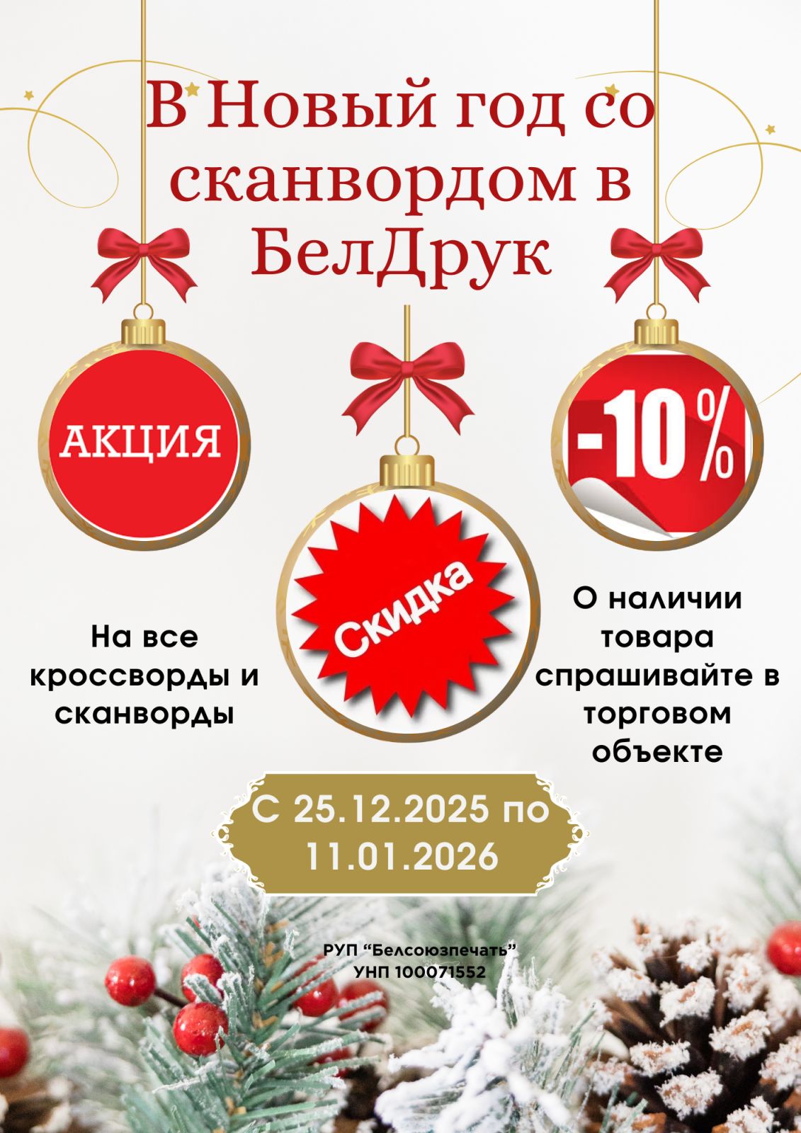 В период новогодних праздников в торговой сети РУП «Белсоюзпечать» (кроме объектов Витебского филиала) нашим покупателям предоставляется скидка 10% на приобретение периодических печатных изданий тематики сканворды и кроссворды. Ждём Вас!
